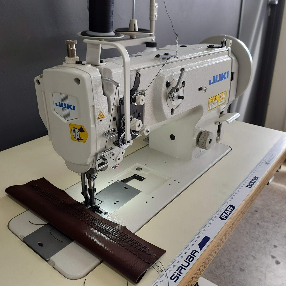 The Juki LU-1508 series in a single needle heavy duty compound feed walking foot machine featuring large capacity top loading bobbin, adjustable stitch length, hook protection safety clutch, semi automatic lubrication, built on bobbin winder and manual reverse stitch. Japanese quality that is built for longevity and reliable performance. Usually supplied with heavy duty sewing bench and your choice of heavy duty clutch motor or electronic needle position servo type motor. Also available in the "NH" extra heavy weight subclass.